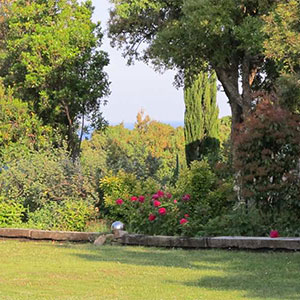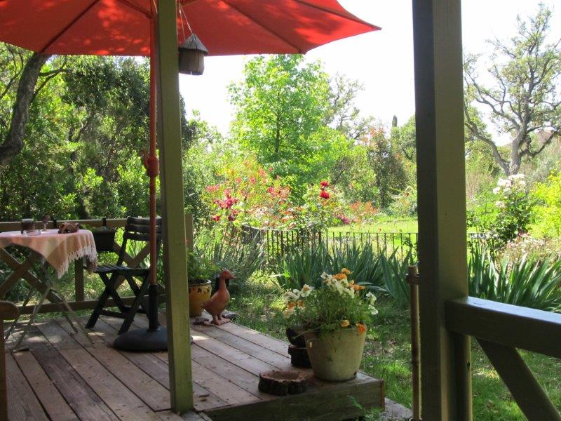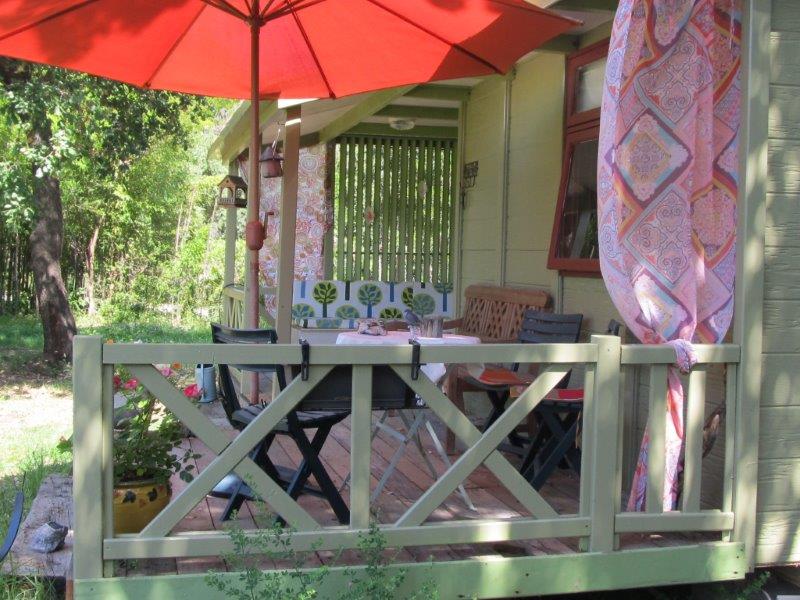 Dusche, Toilette sind räumlich abgeteilt. Die überdachte Terrasse hat einen herrlichen Blick in den Garten.